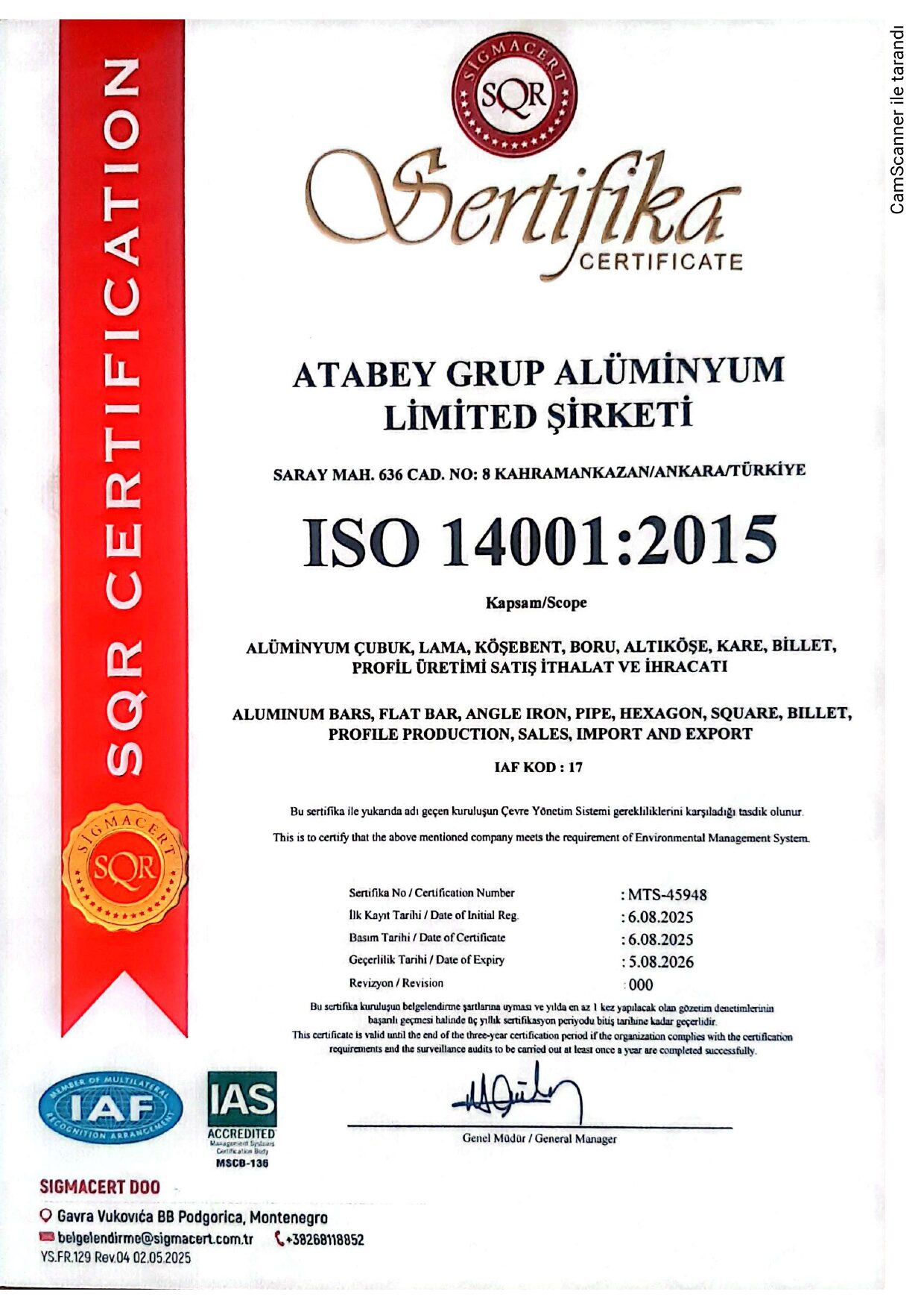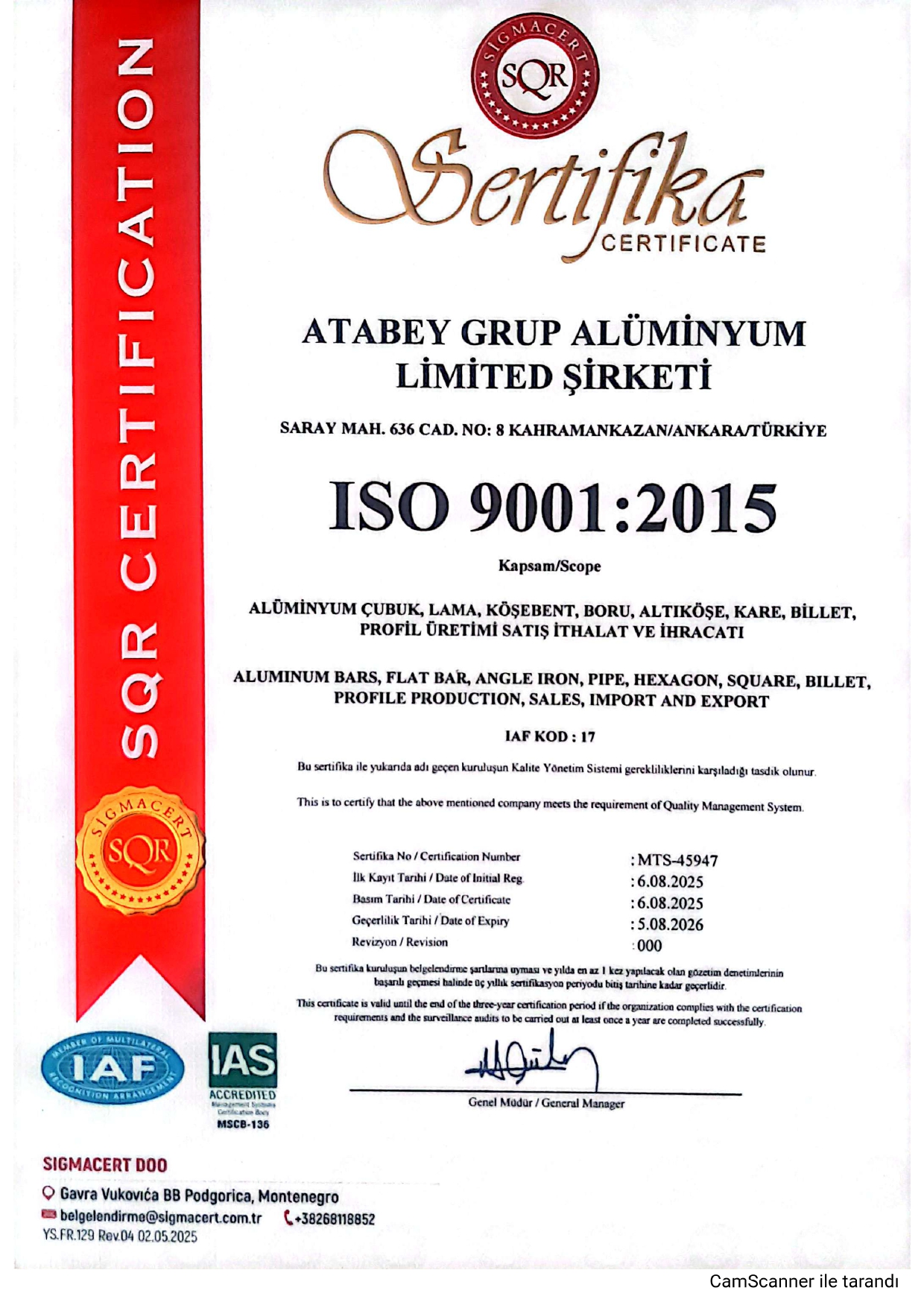 Alüminyum Kare
